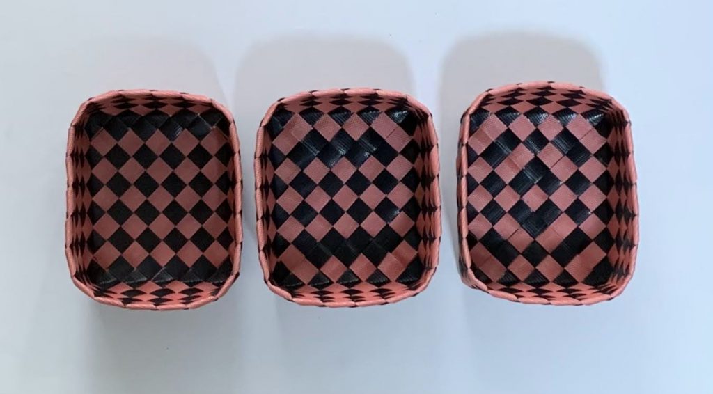折り返しラインで折り返し方向を変えれば、違う模様になる。ということで、改めて、同じじサイズで同じ底配置から、基本のクロスの市松模様、そしてストライプのかごを作ってみました。