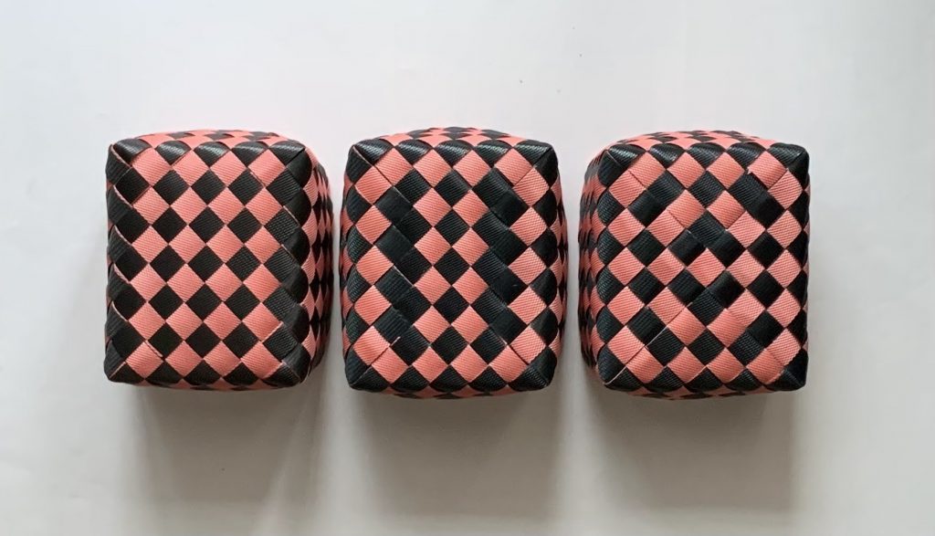 縦横の四角数は5と6、最初の配置や折り返しは同じで、底の中でどこまで重ねるか、を変えた3種、格子(ドット)模様です。