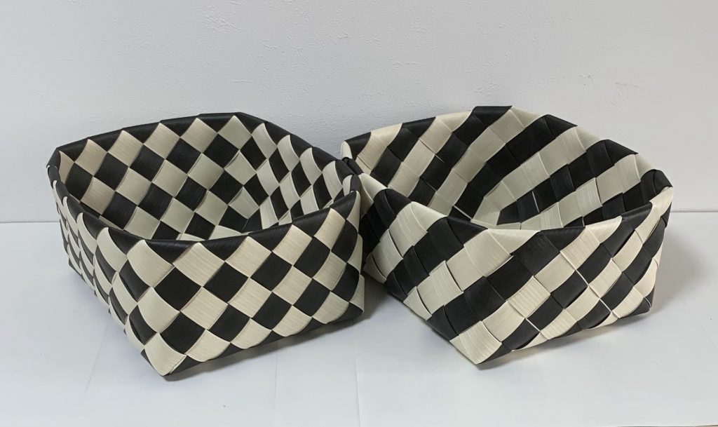 折り返しラインで折り返し方向を変えれば、違う模様になる。ということで、改めて、同じじサイズで同じ底配置から、基本のクロスの市松模様、そしてストライプのかごを作ってみました。