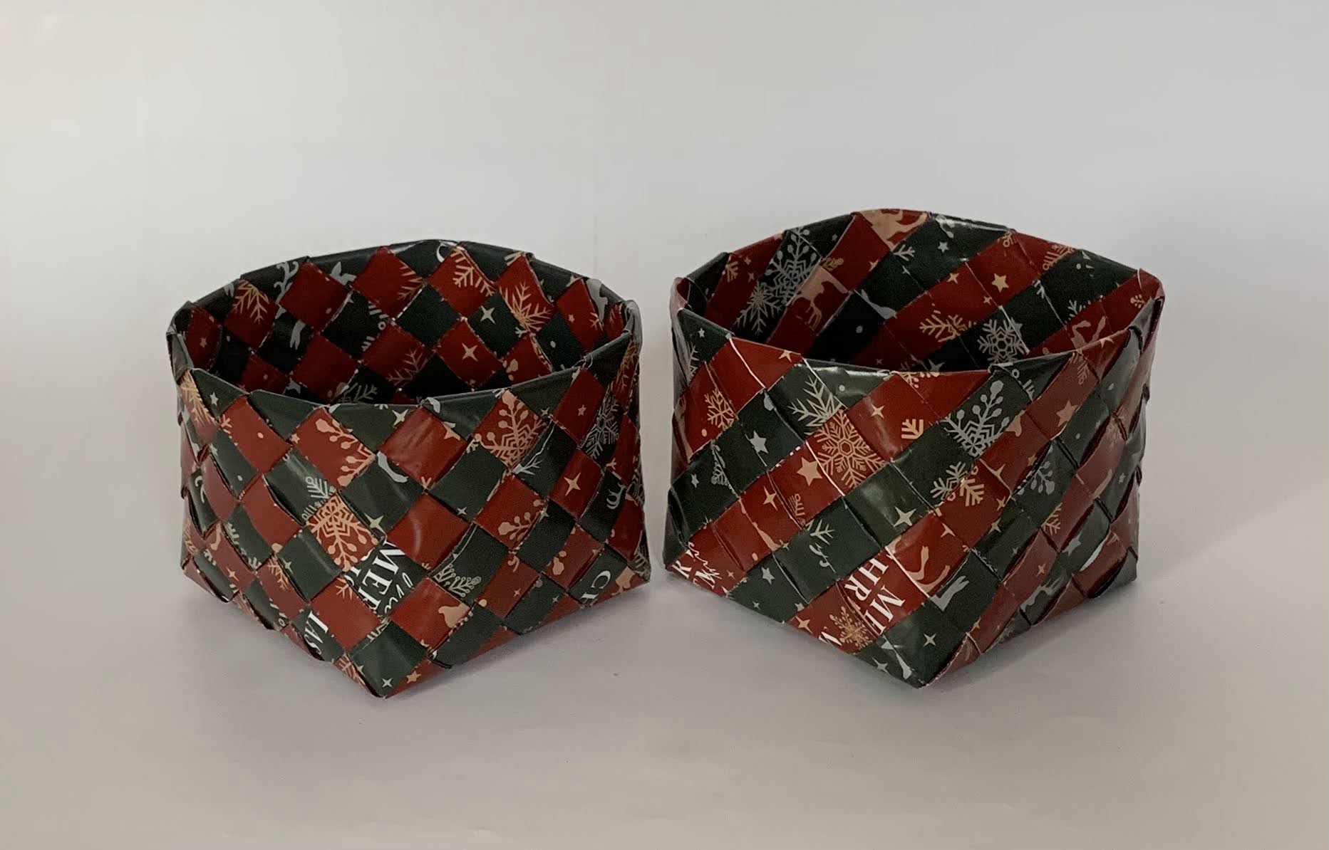 ストライプの方は同色を重ねて外側への折り返し、格子の方は内外半分ずつで、内側の折り返しは底の辺までです。テープの幅を少し変えたので、入れ子にしたり蓋にしたりできます。