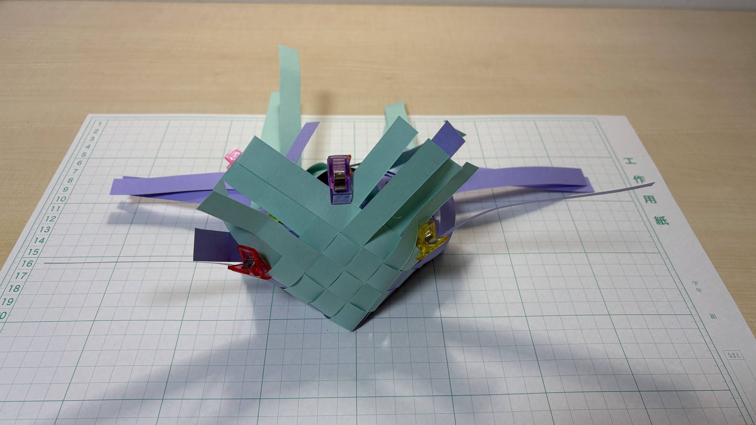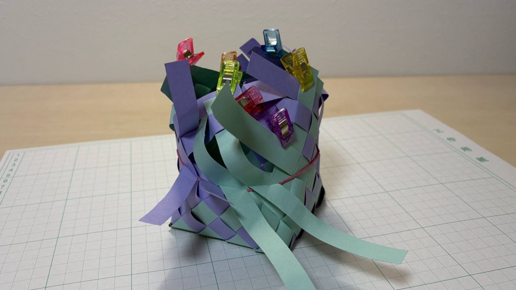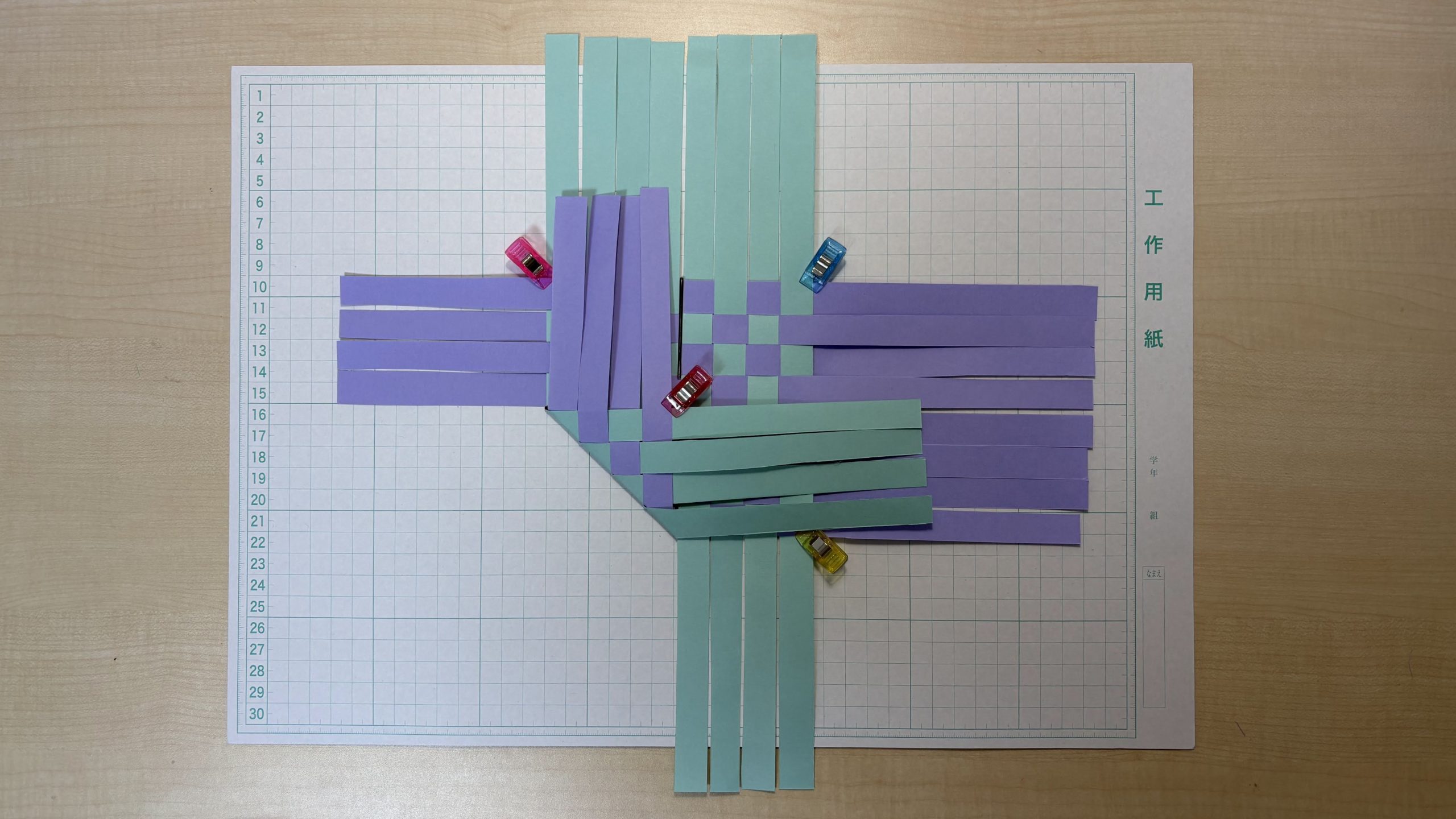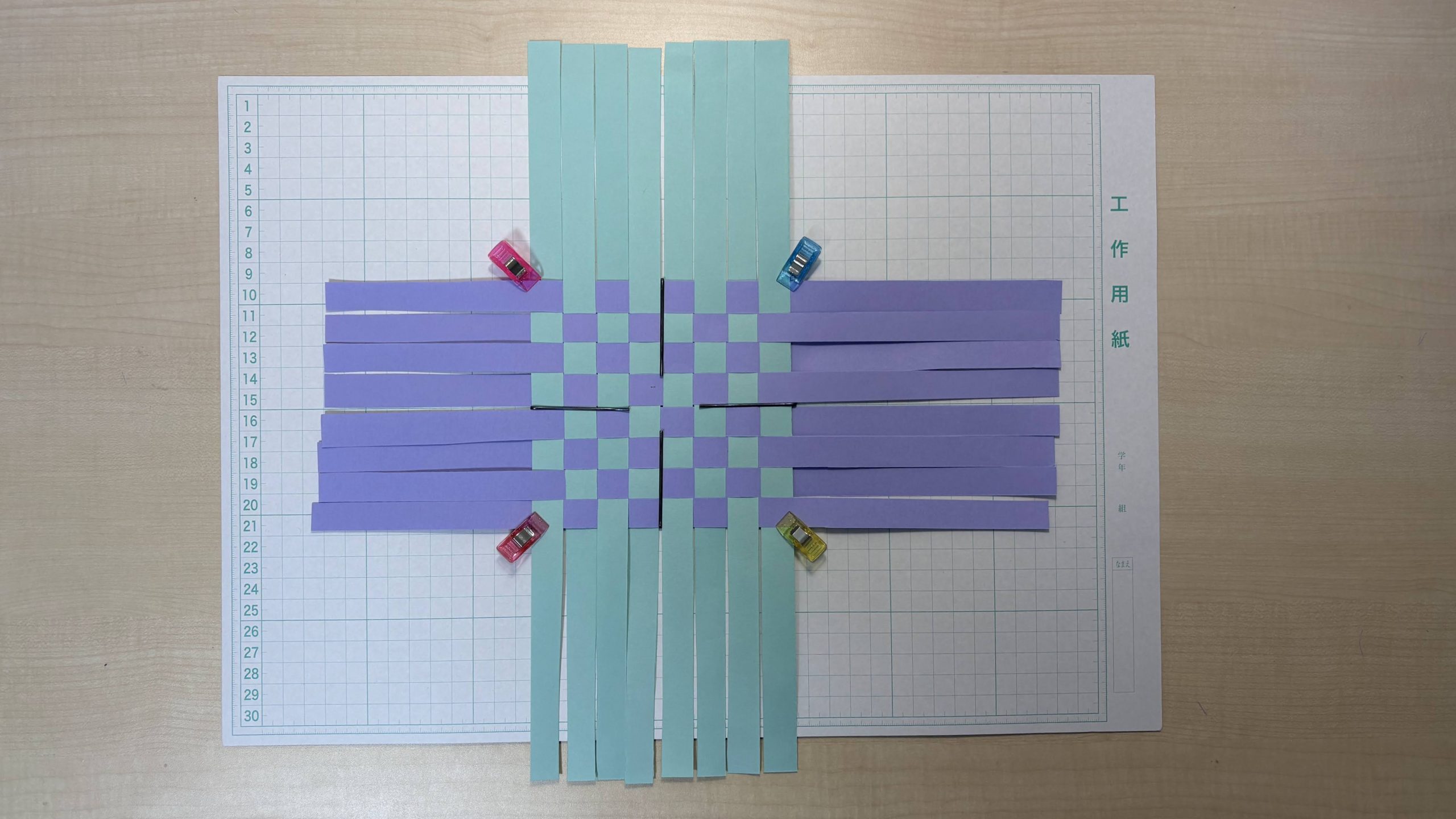 中央を合わせて格子に編んだら、四隅をクリップで留めます。