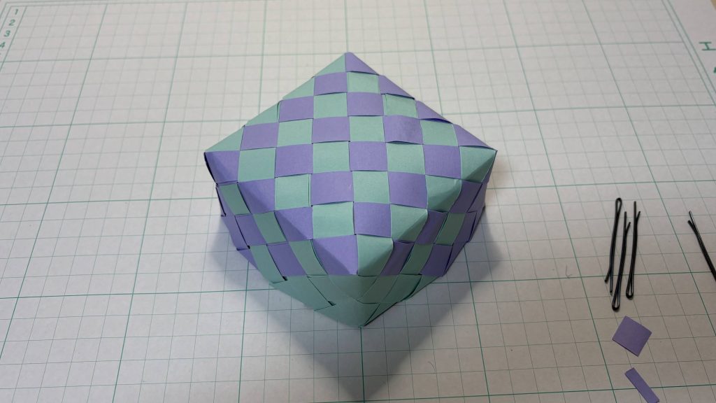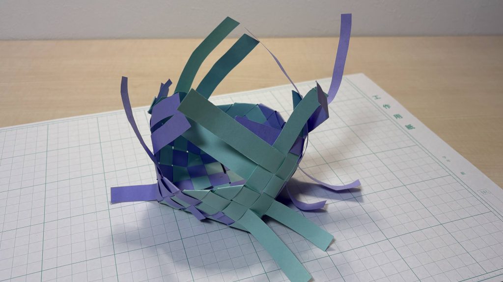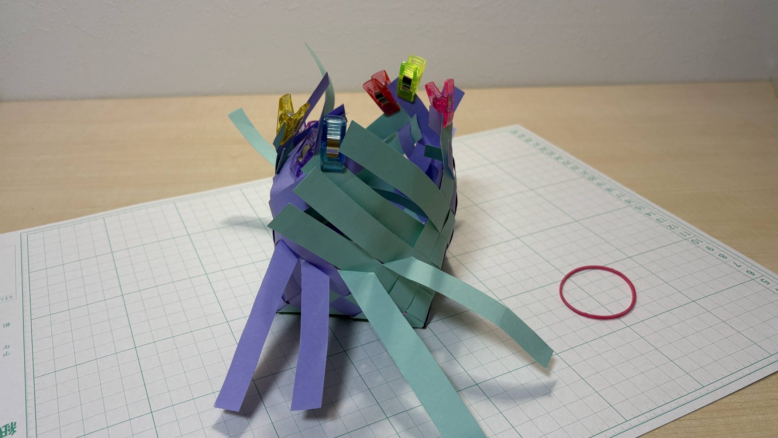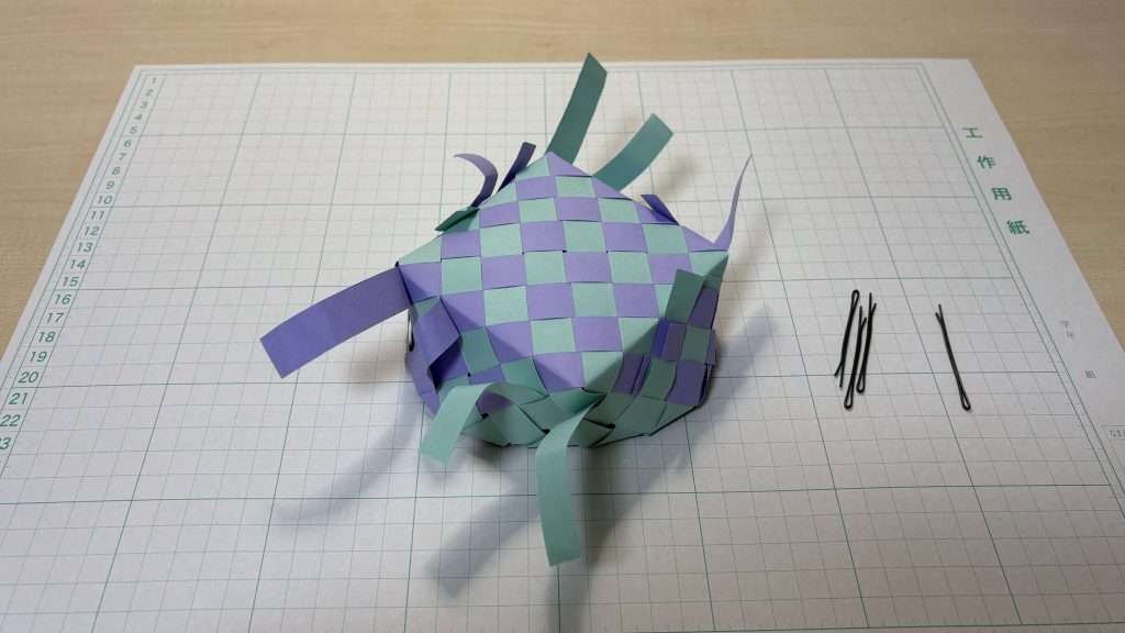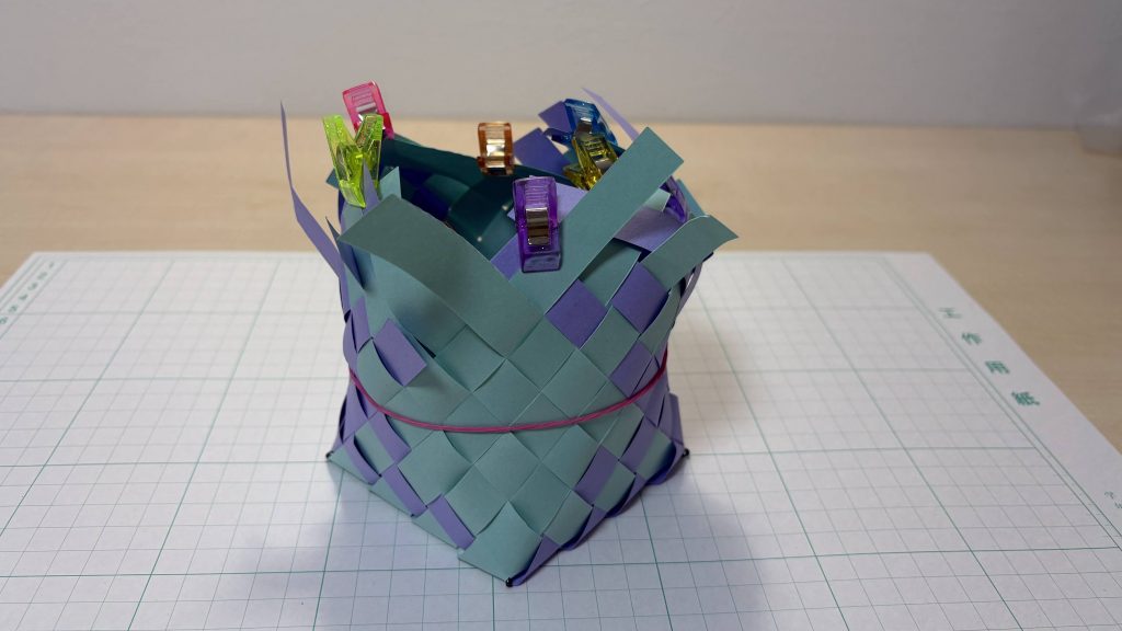 中央を合わせて格子に編んだら、四隅をクリップで留めます。