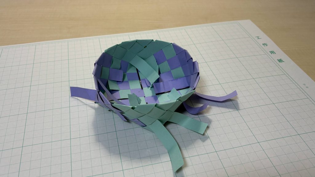 それぞれのテープの長さで、底の編み目の適当な箇所で隠れるように差し込みます。