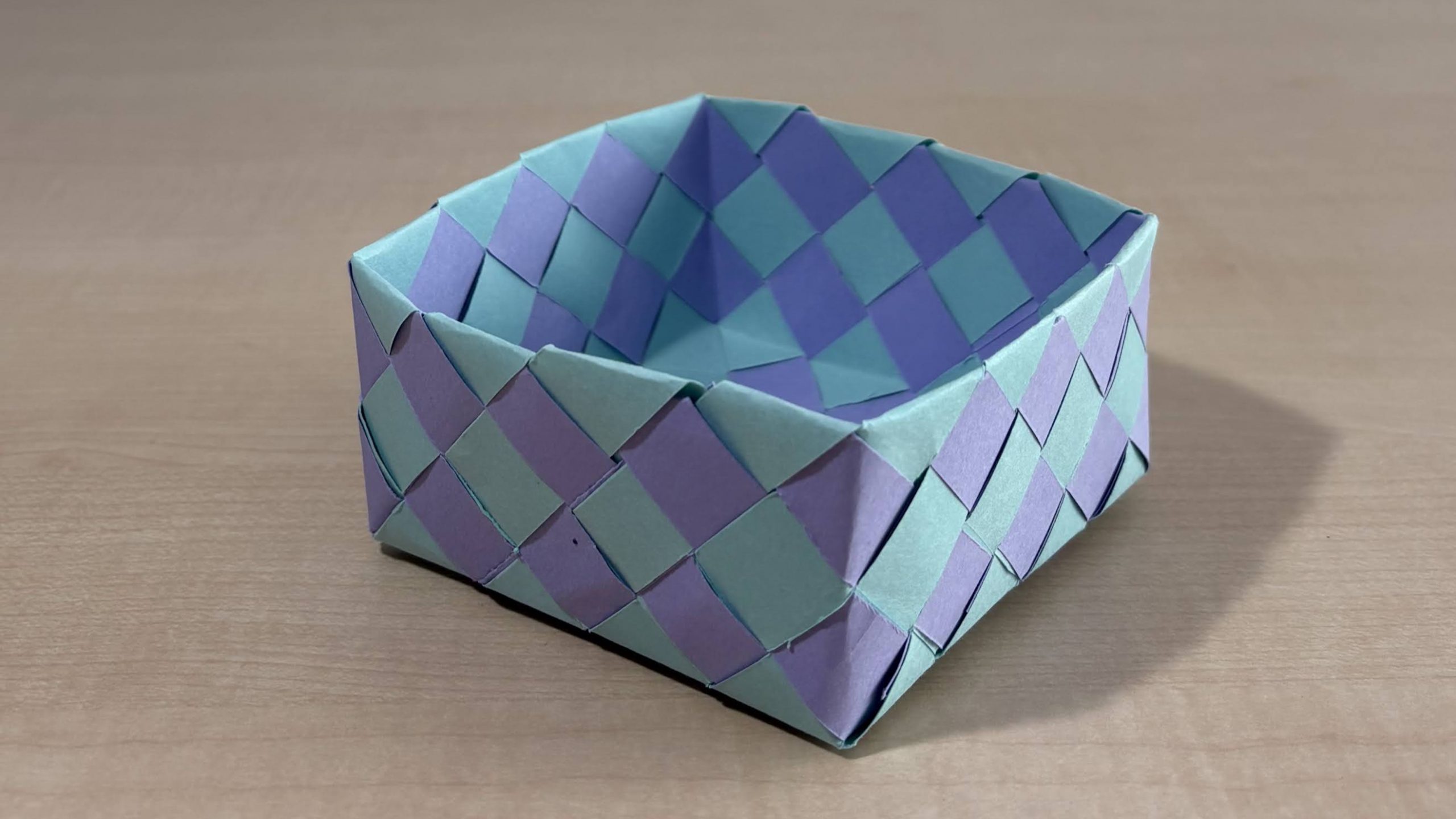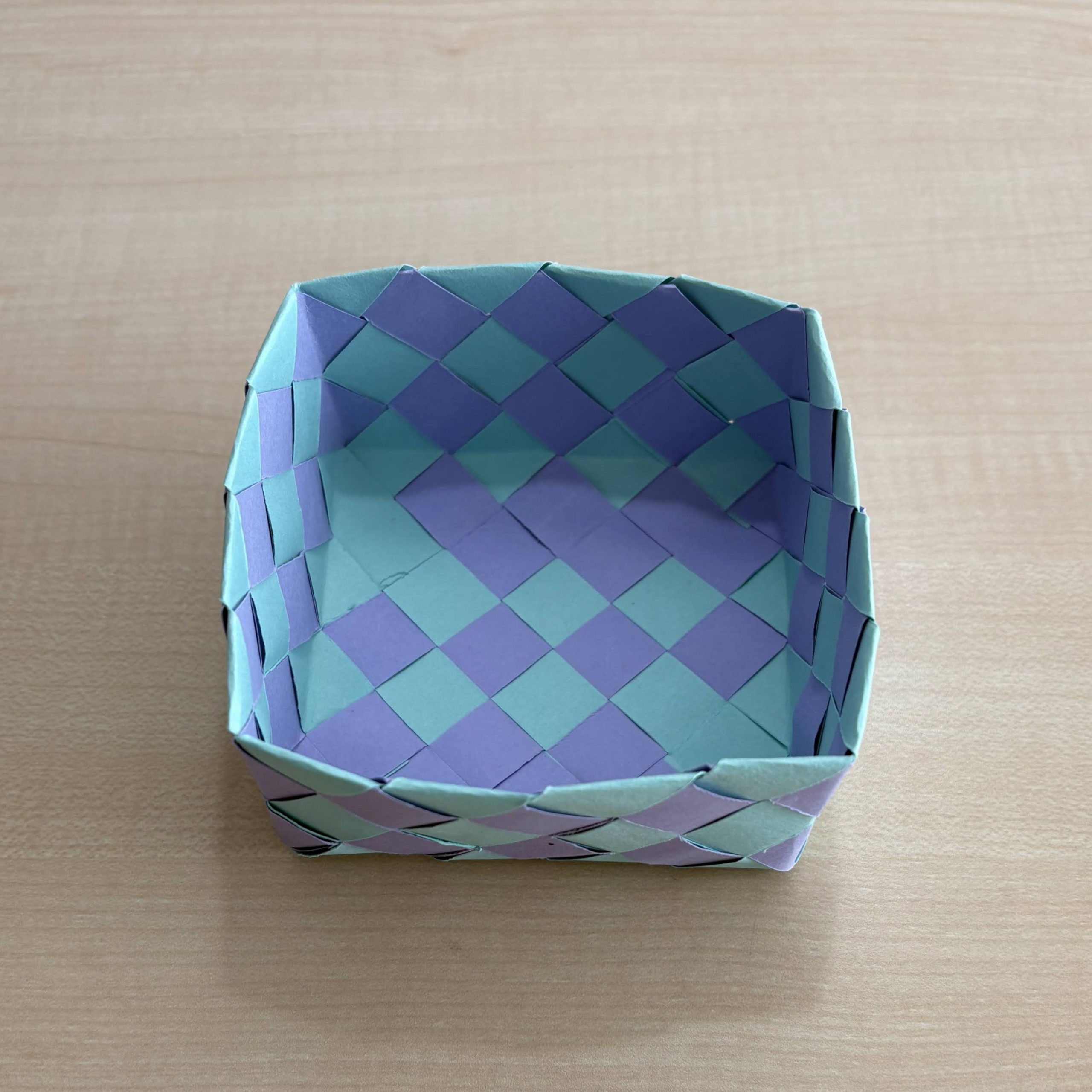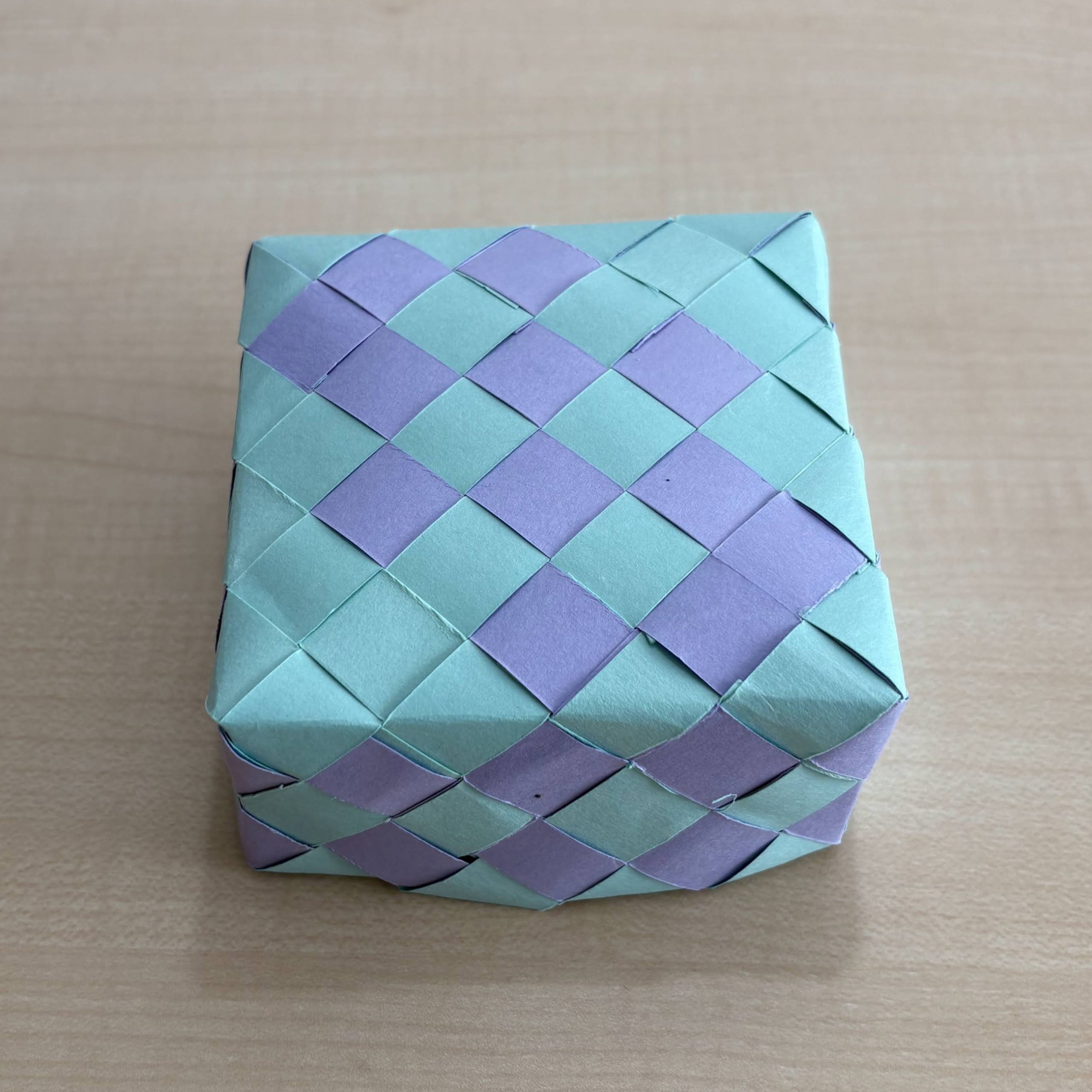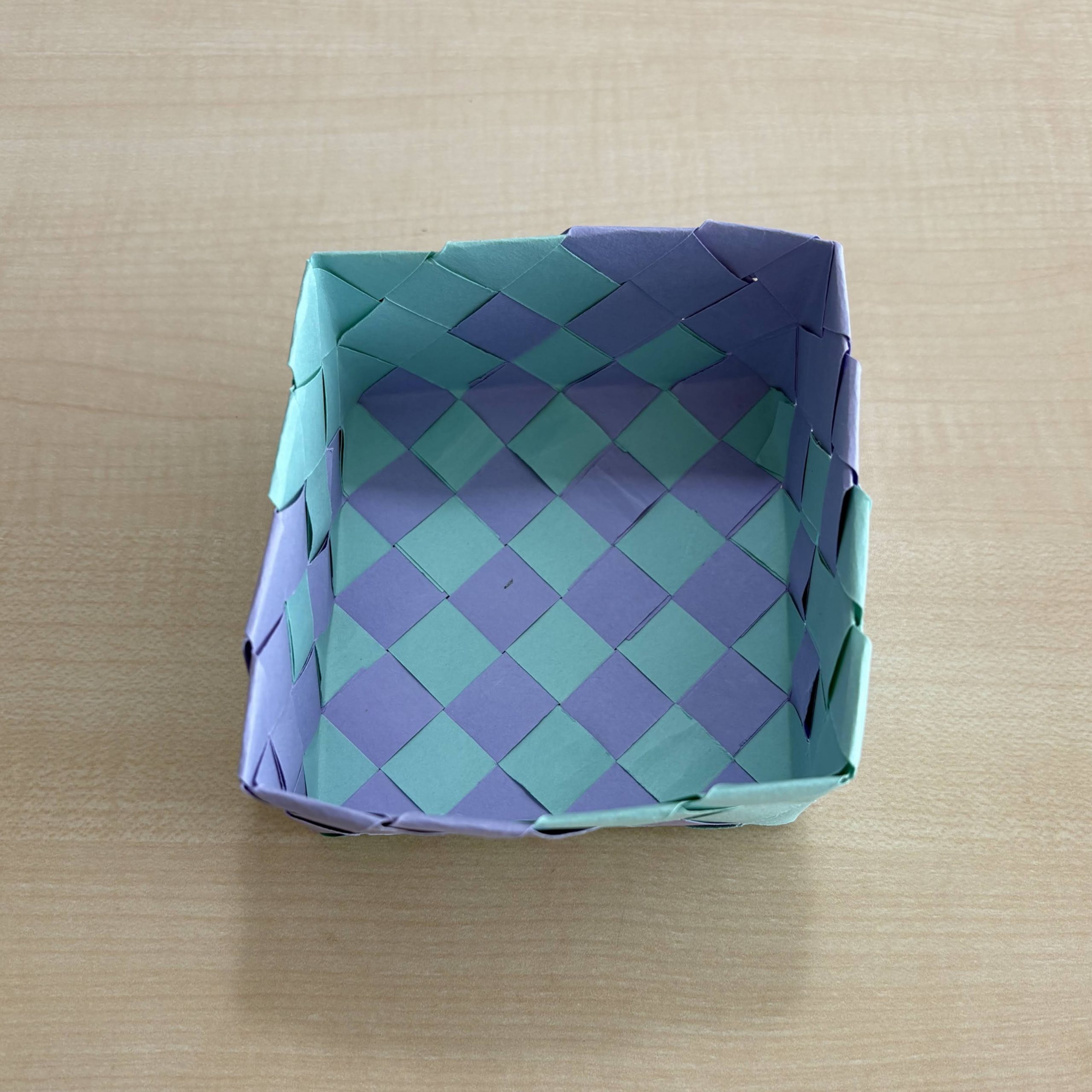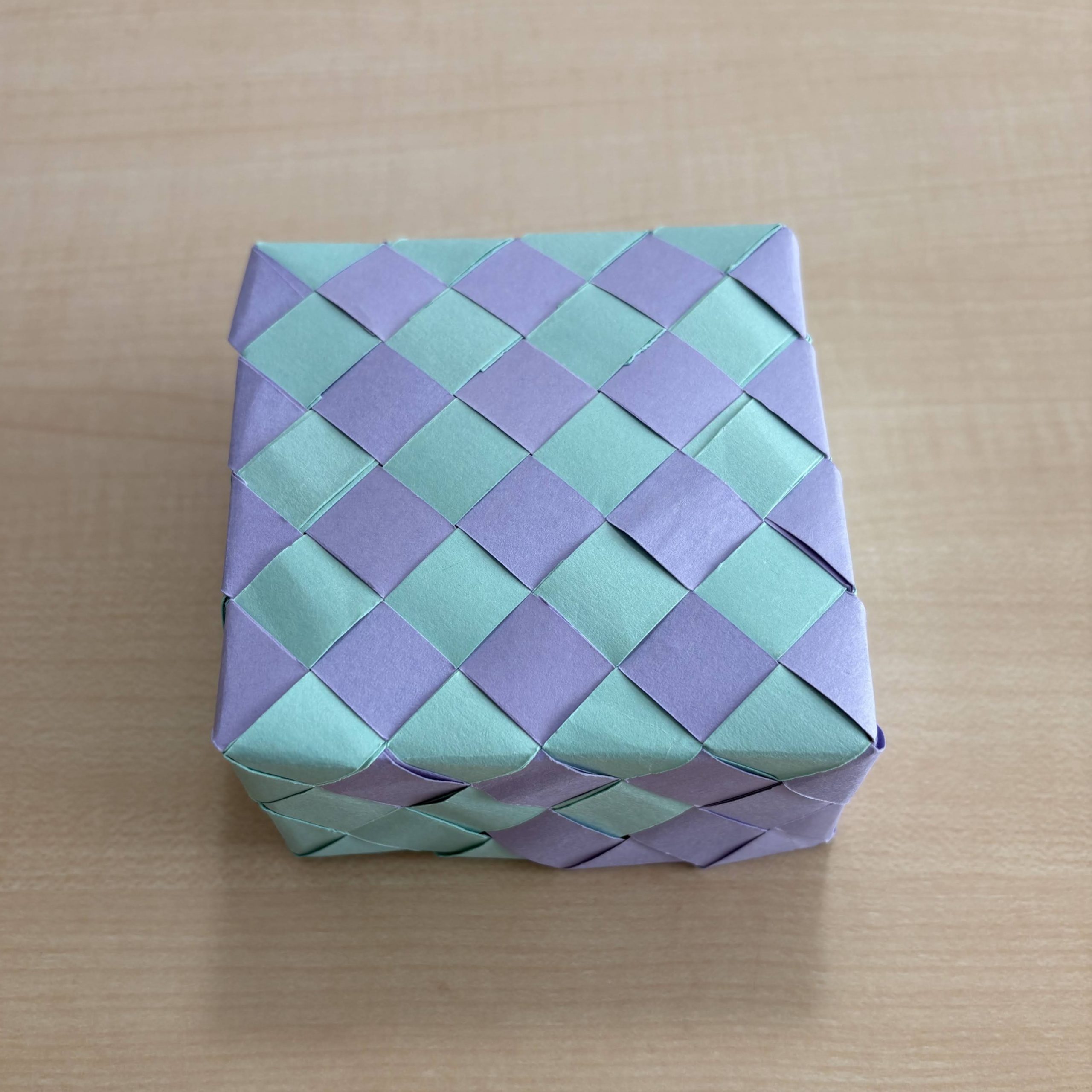 2色の格子模様の箱が、ふたつできました。使用したテープ、本数、サイズ、編み方、すべて同じです。比べてみましょう。