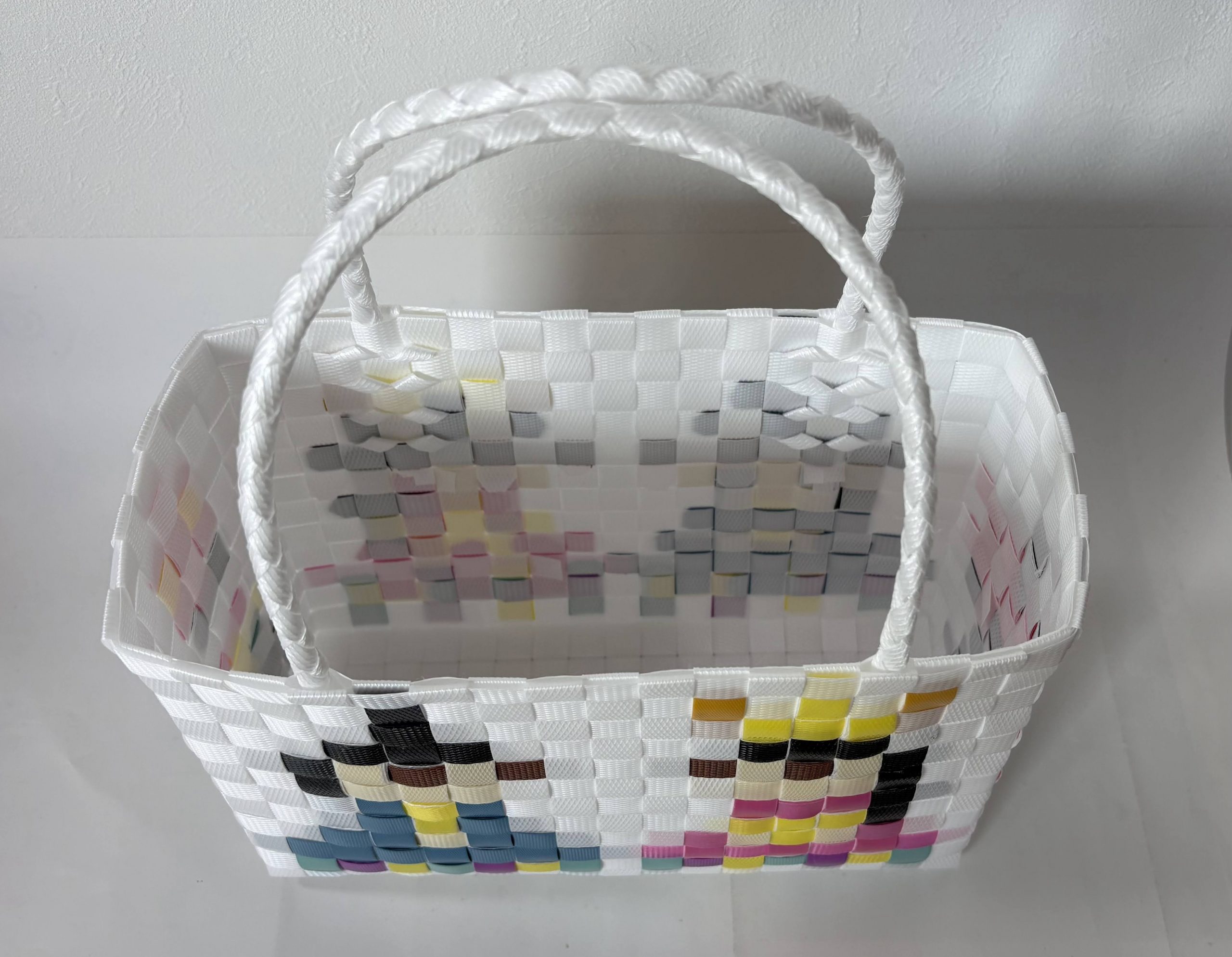 プラかごに、後差し模様、つまり後からバンドを差し込んで模様を作るという説明をすると、多くの人がまず「ドット絵」を連想するようです。ドット模様と紛らわしいので、本稿では以降「ピクセル絵」と呼ぶことにします。