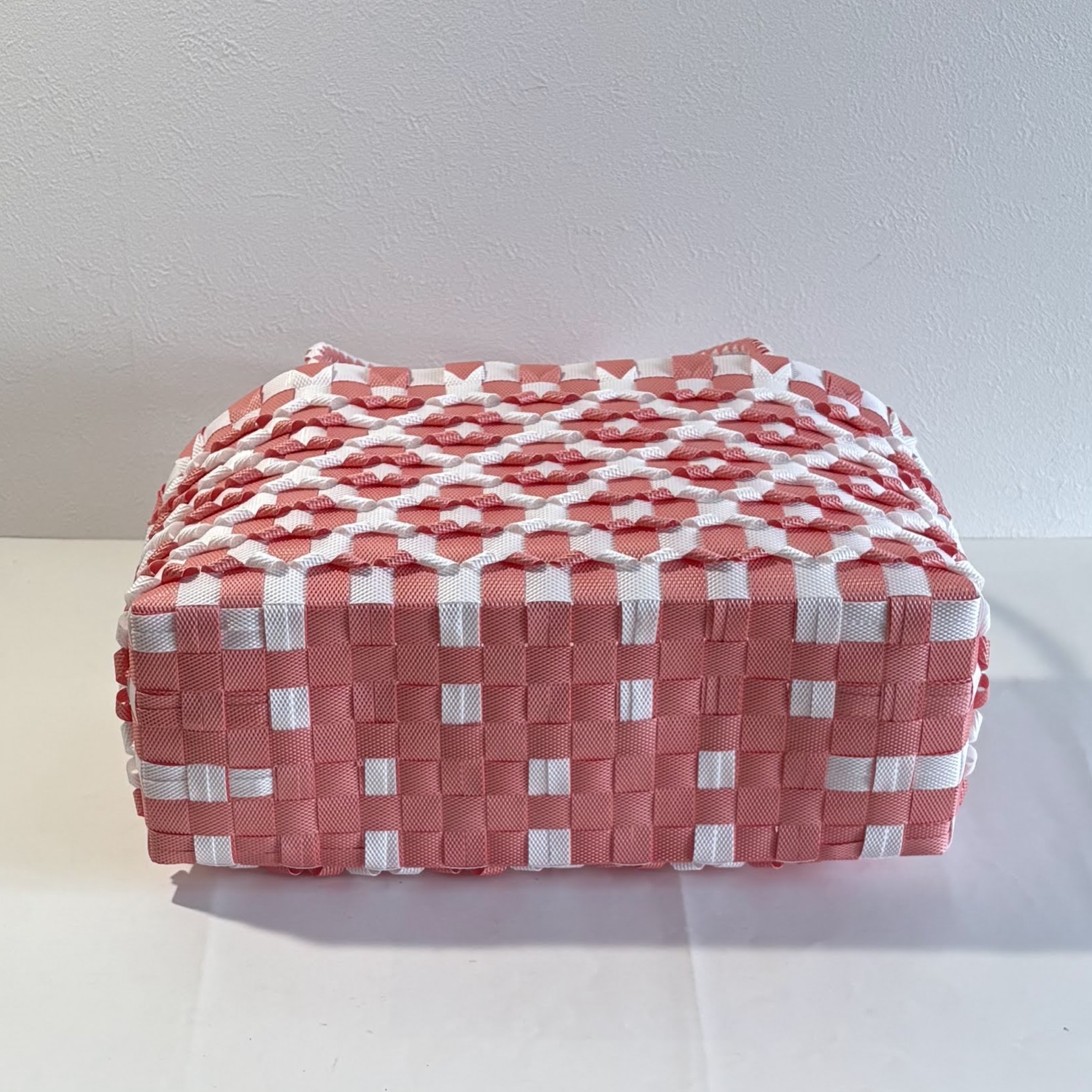 内側は格子模様です。側面に通した後差しひもを、そのまま底に3本分重ねて始末しています。