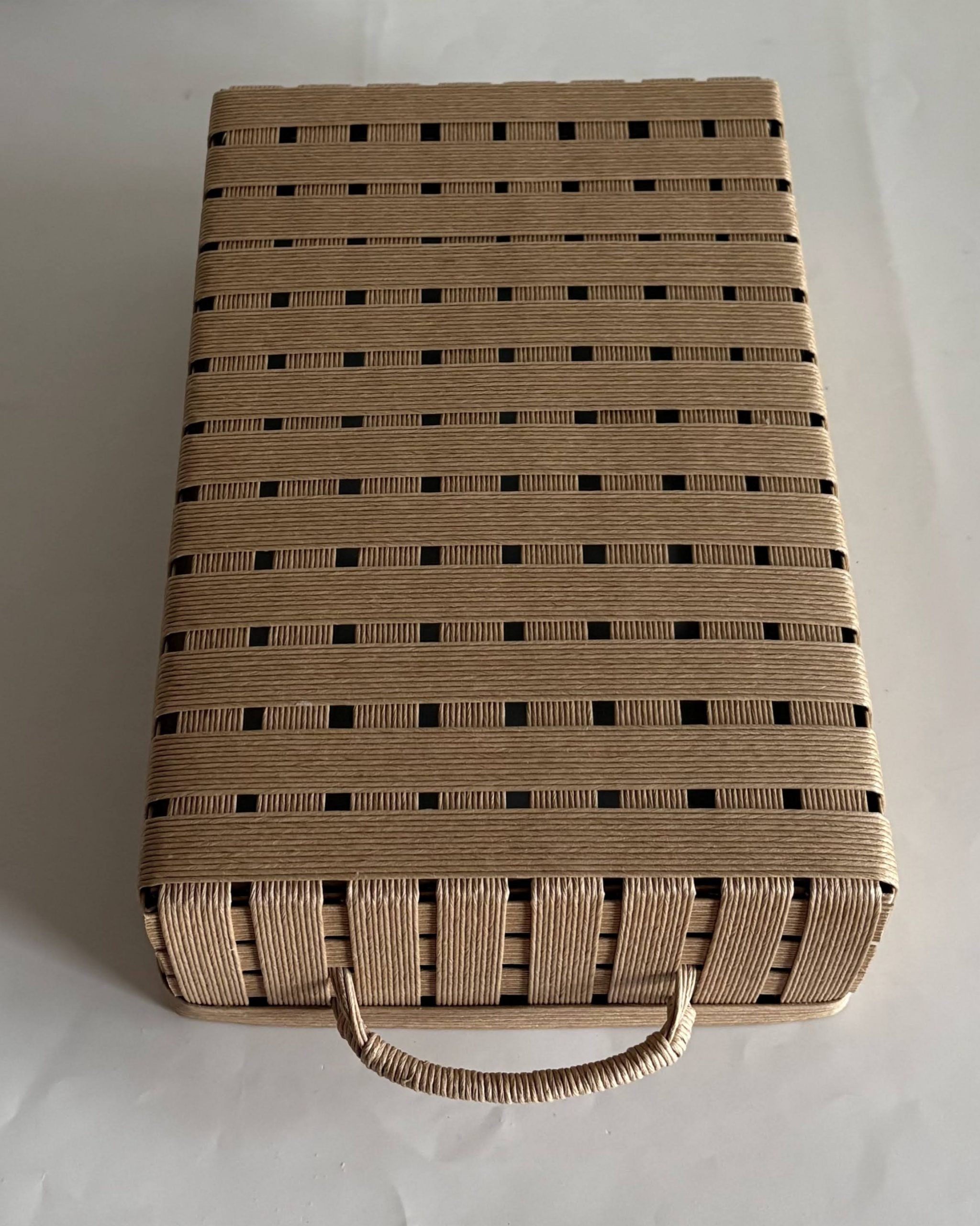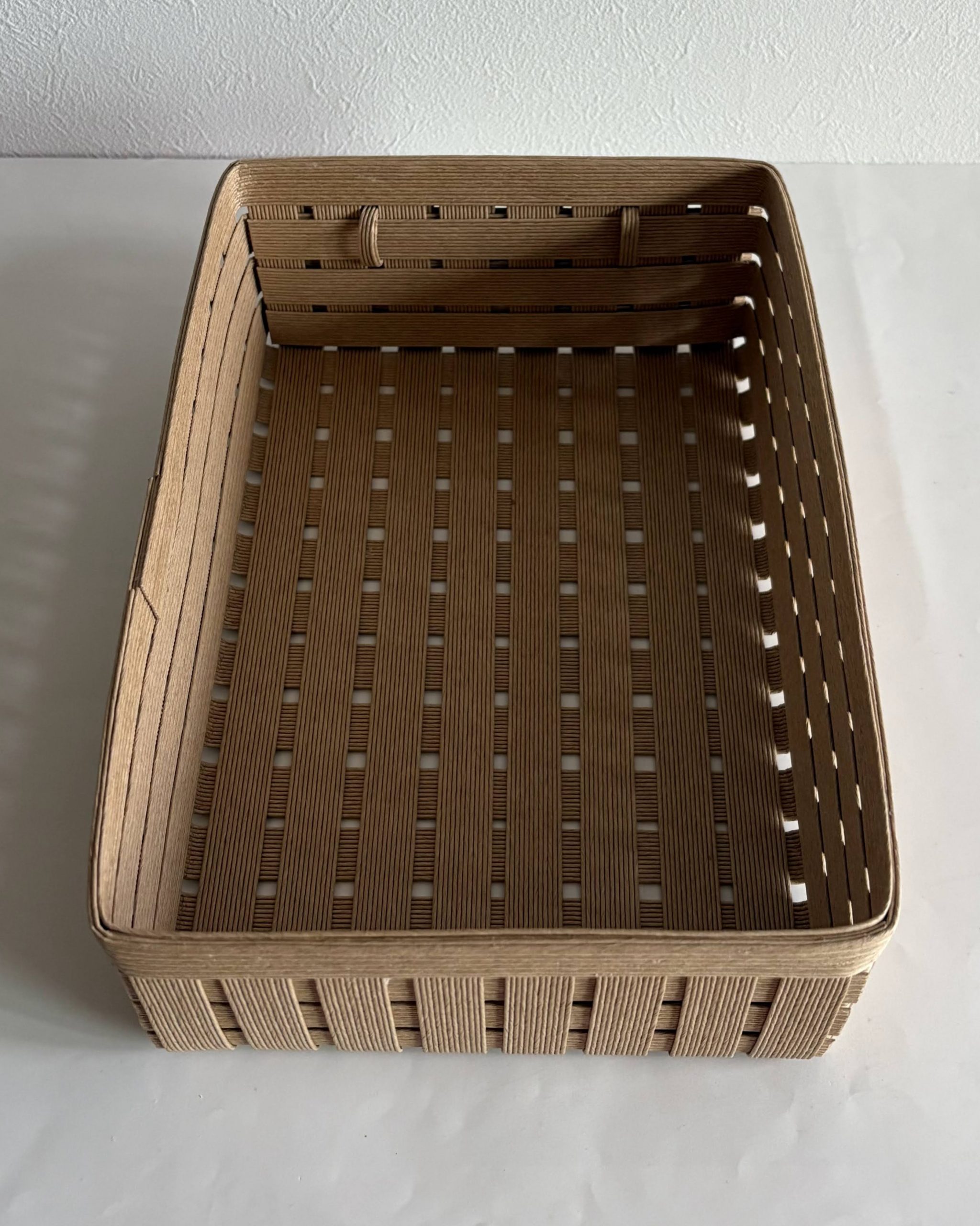 短辺側全体をフラップにして、三重に重ねました。持ち手を付けて引き出すので、補強にもなります。組み立てた後に、縁を内外に貼り付けて全体を固定しました。ちょっとシャドウボックス風です。
