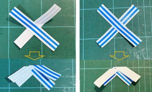 二色が交差する高さ位置で対角線に折ったとしても、下図・左のように、同じ色が重なるだけです。では、下図・右のように、一色が交差する高さ位置[※]で、セットではなくどちらかだけ折り返すのは? でも、一本だけでは、内側と外側が分離してしまいます。