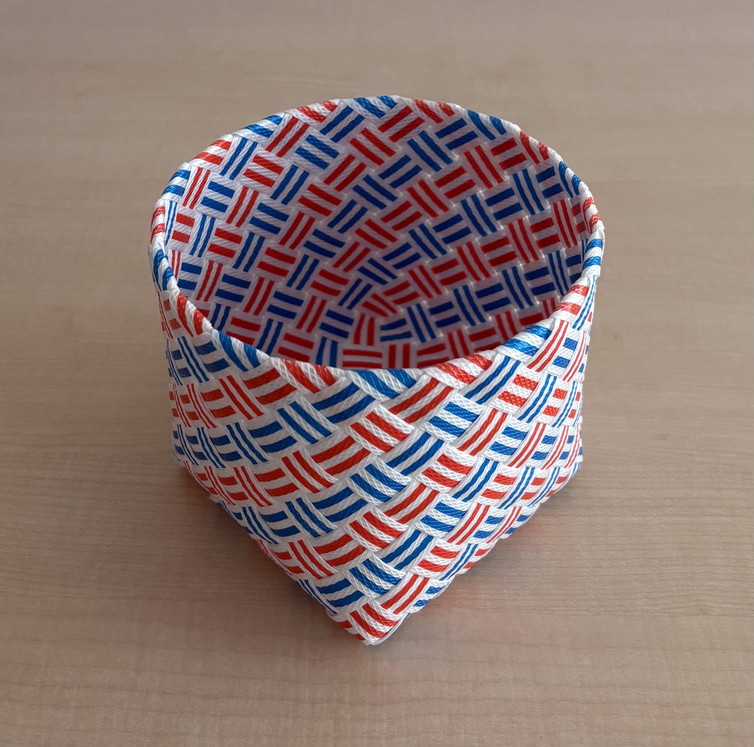結局のところ、この試作例の片面つまり裏表のあるバンドで作れたのは、既知のパターンをそのまま底まで折り返しただけのかごです。
