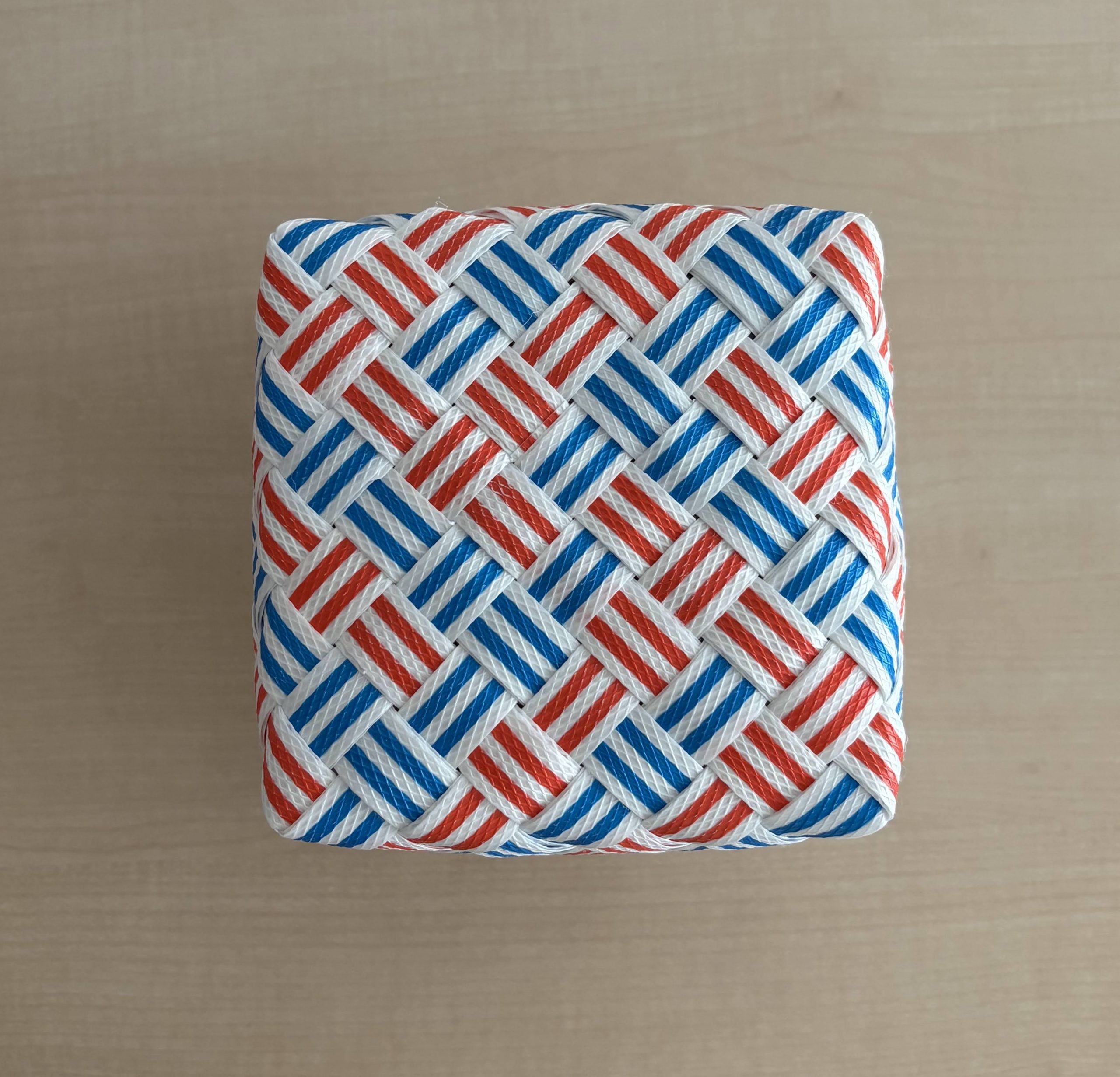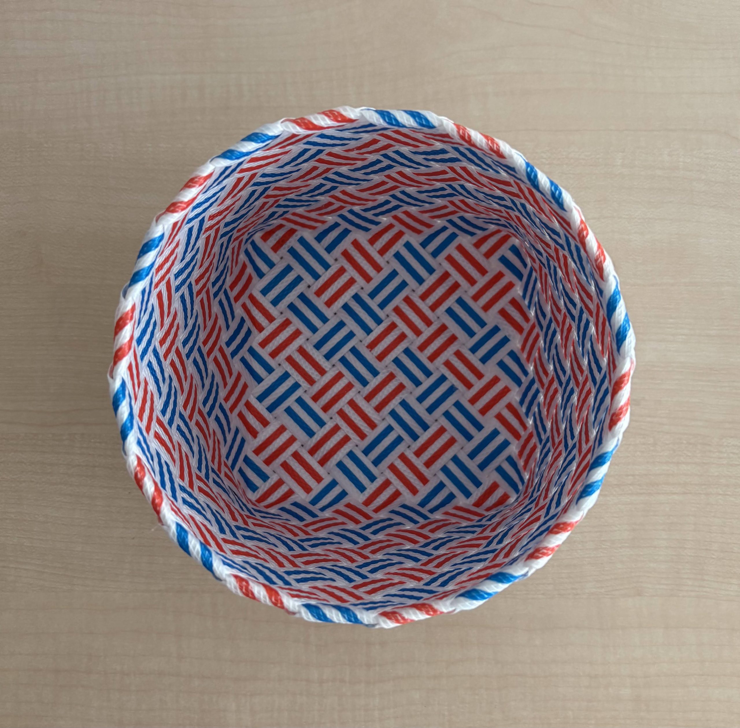 底が正方形のライン模様のかごなら何とか。でも、ドット模様のような交色にするのは難しそうです。