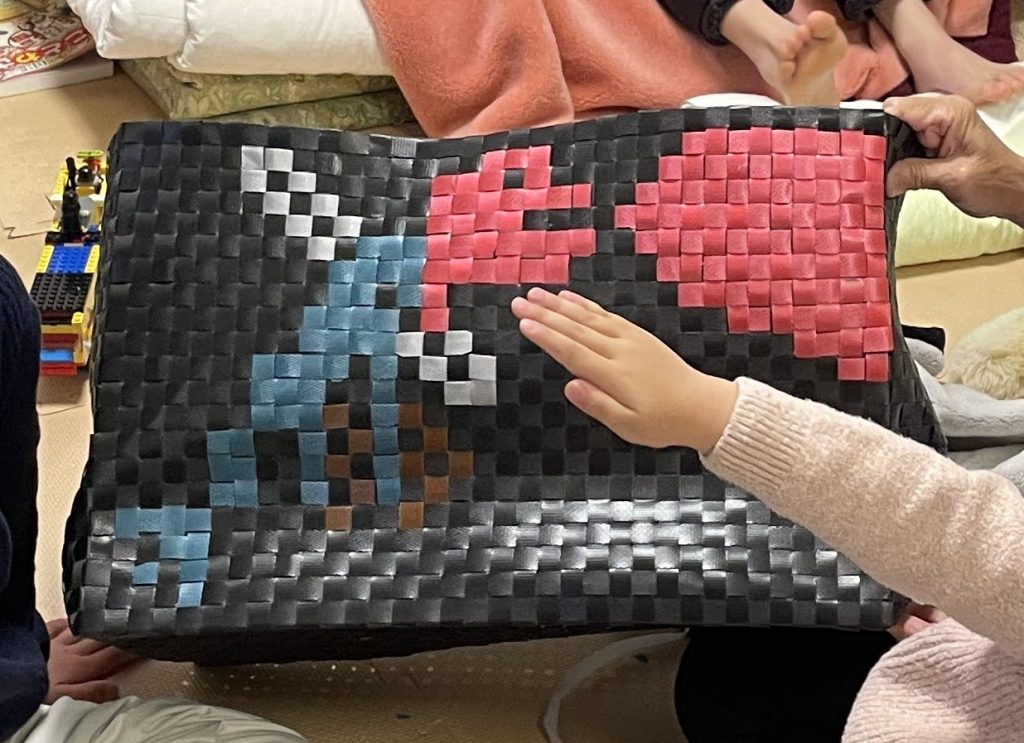 ぬいぐるみ入れに毎日使っているので、ちょっと変形してますけどとのことですが、その後、皆で完成させたというかごの写真を、ママが送ってくれました。